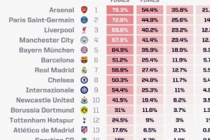 Opta欧冠夺冠概率(前10位):