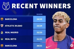 德转列近10年国王杯冠军:巴萨5次登顶,皇马仅在2023年夺冠