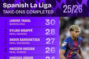 本赛季西甲成功过人榜:亚马尔30次居首,姆巴佩28次第二